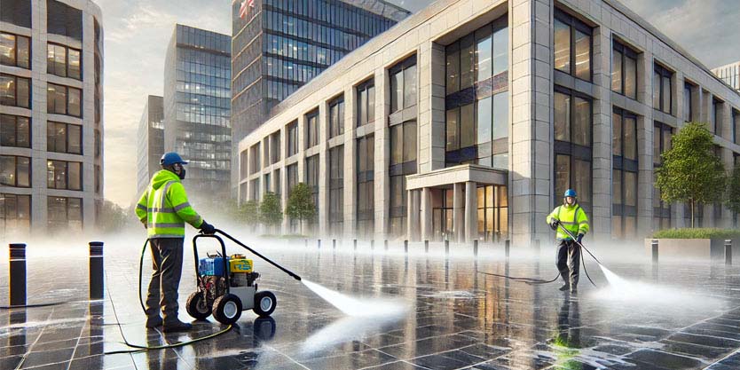 Modern commercial spaces require a clean and professional appearance. Large paved areas, entrances, walkways, and surroundings of office buildings are constantly exposed to dirt, traffic residue, algae, and weather-related stains.