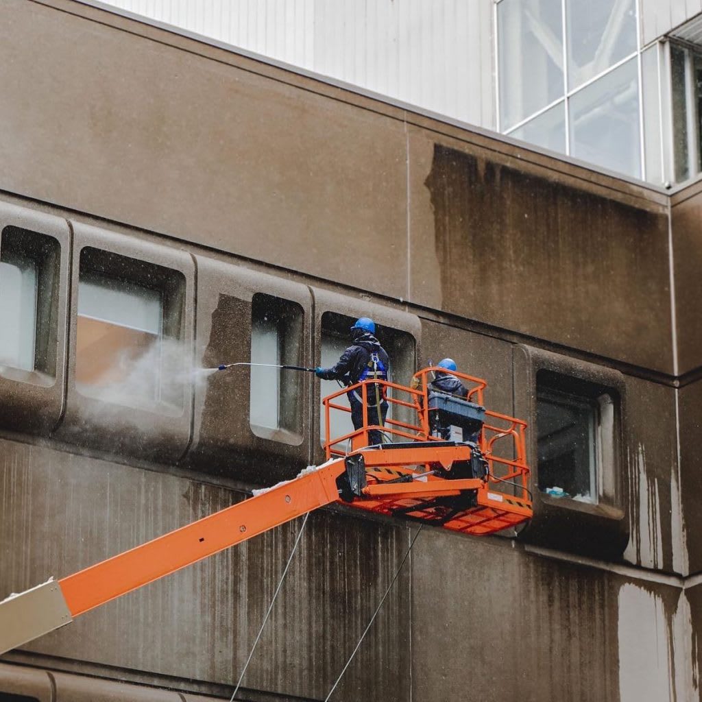 High-level exterior surfaces require specialist equipment and experienced handling. Facades of commercial buildings are constantly exposed to pollution, weathering, algae, and staining that standard cleaning methods cannot remove.